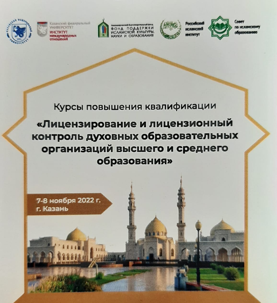 Бүген Казан (Идел буе) федераль университетының Халыкара мөнәсәбәтләр институтында Россия ислам институты һәм Татарстан Республикасы мөселманнарының Диния нәзарәте катнашында «Югары һәм урта белем бирүче рухи мәгариф оешмаларын лицензияләү һәм лицензион контроль» квалификация күтәрү буенча өстәмә һөнәри белем бирү программасы буенча квалификация күтәрү курслары ачылды.
