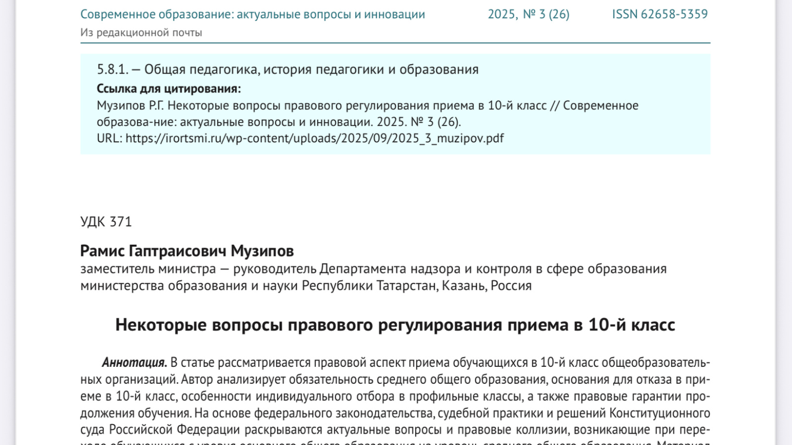 Музипов Р.Г. Некоторые вопросы правового регулирования приема в 10-й класс // Современное образованик: актуальные вопросы и инновации. 2025. № 3 (26).